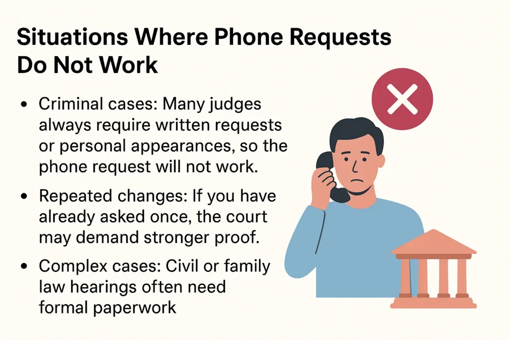 - Criminal cases: Many judges always require written requests or personal appearances, so the phone request will not work.